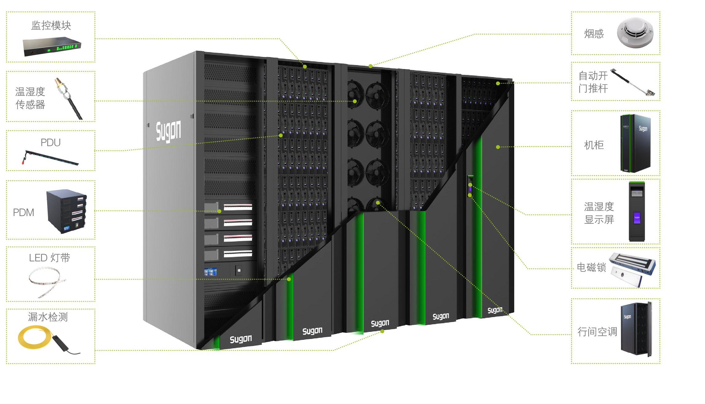 曙光C1000机柜排级微模块基础设施系统,是曙光公司为解决高密度服务器散热问题所推出的以机柜排为单位、封闭风道的,包含机柜、配电、制冷、监控等子系统的整体解决方案,充分适应高性能计算应用对机房基础设施的节能性、扩展性、智能性及建设周期的新要求,有效解决了服务器设备高密度安装时产生的散热问题、配电问题、线缆管理问题及监控问题。